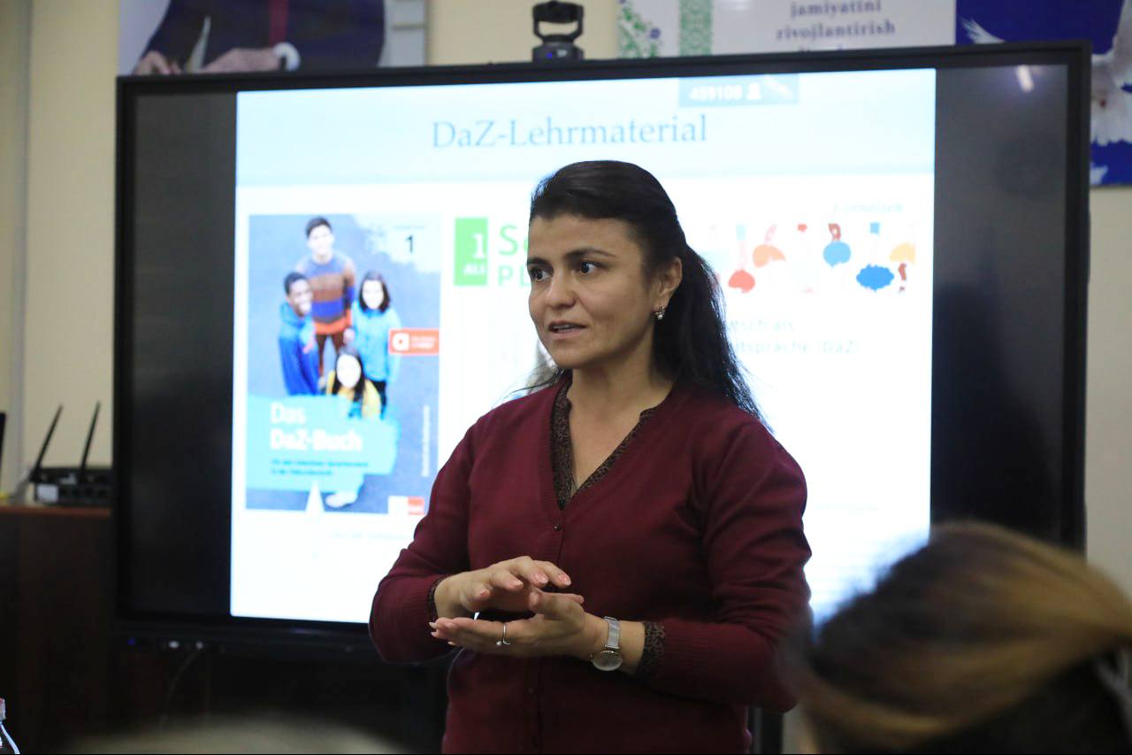 Vorher aber stand „Deutsch als Zweitsprache“ (DaZ/DaF) im Zusammenhang mit Mehrsprachigkeit auf dem Vormittagsprogramm mit Übungen und Aufgaben sowie zwei Videos mit Unterrichtsbeispielen. Aber erst fünf Minuten vor Beginn war klar, dass es im großen Konferenzraum sein wird. Und gleich zu Beginn stieß eine große Gruppe aus der englischen Abteilung dazu und schließlich kamen zu Glück noch die mir bekannten drei Techniker, die es tatsächlich schafften, zum Bild auch den Ton zu bringen. Also alles gut, nur meine Beobachtungsaufgaben waren durch die Englisch-Leute etwas beeinträchtigt. Die Denk- und Partner-Gesprächsphase lief schwer an, die Videos waren schon anregender und mit der Erlaubnis, auch usbekisch sprechen zu dürfen, gab es sogar so etwas wie ein angeregtes Gespräch am Ende. Die Einblicke in deutsche Klassenzimmer und die Art, wie Lehrkräfte mit den Schülern umgingen, jedenfalls in diesen Mitschnitten, hat Interesse geweckt. Dazu gibt es auch einen kurzen Bericht und viele Bilderauf der Webseite der Universität.